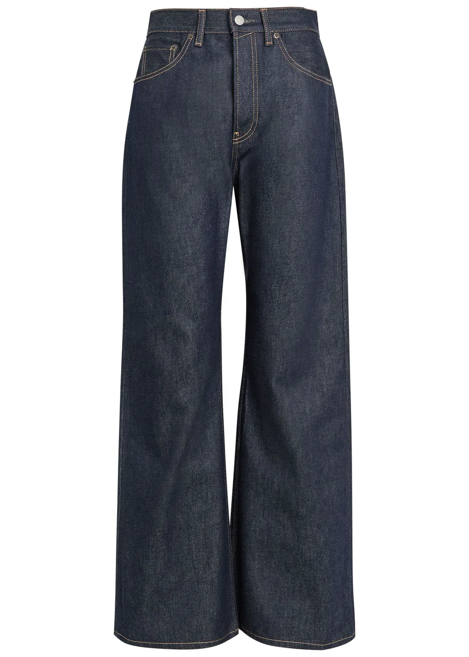 Info & Care Acne Studios denim jeans High-rise fit, wide-leg cut, belt loops, five pockets, designer plaque at back Partially concealed button fastenings at front 100% cotton Hand wash Size & Fit Front rise: 11 inches/ 28cm Inside leg length: 32 inches/ 81.5cm Midweight Model is 5'9"/ 175cm and wears a size W27