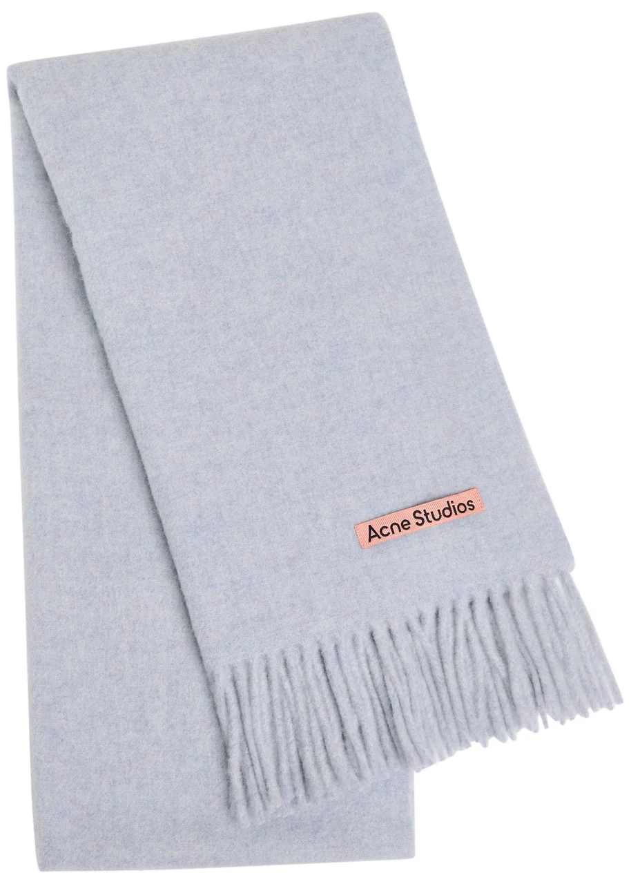 Info & Care Acne Studio wool scarf Designer plaque, fringed ends 100% wool Dry clean Size & Fit Width: 16 inches/ 40cm Length: 78.5 inches/ 200cm