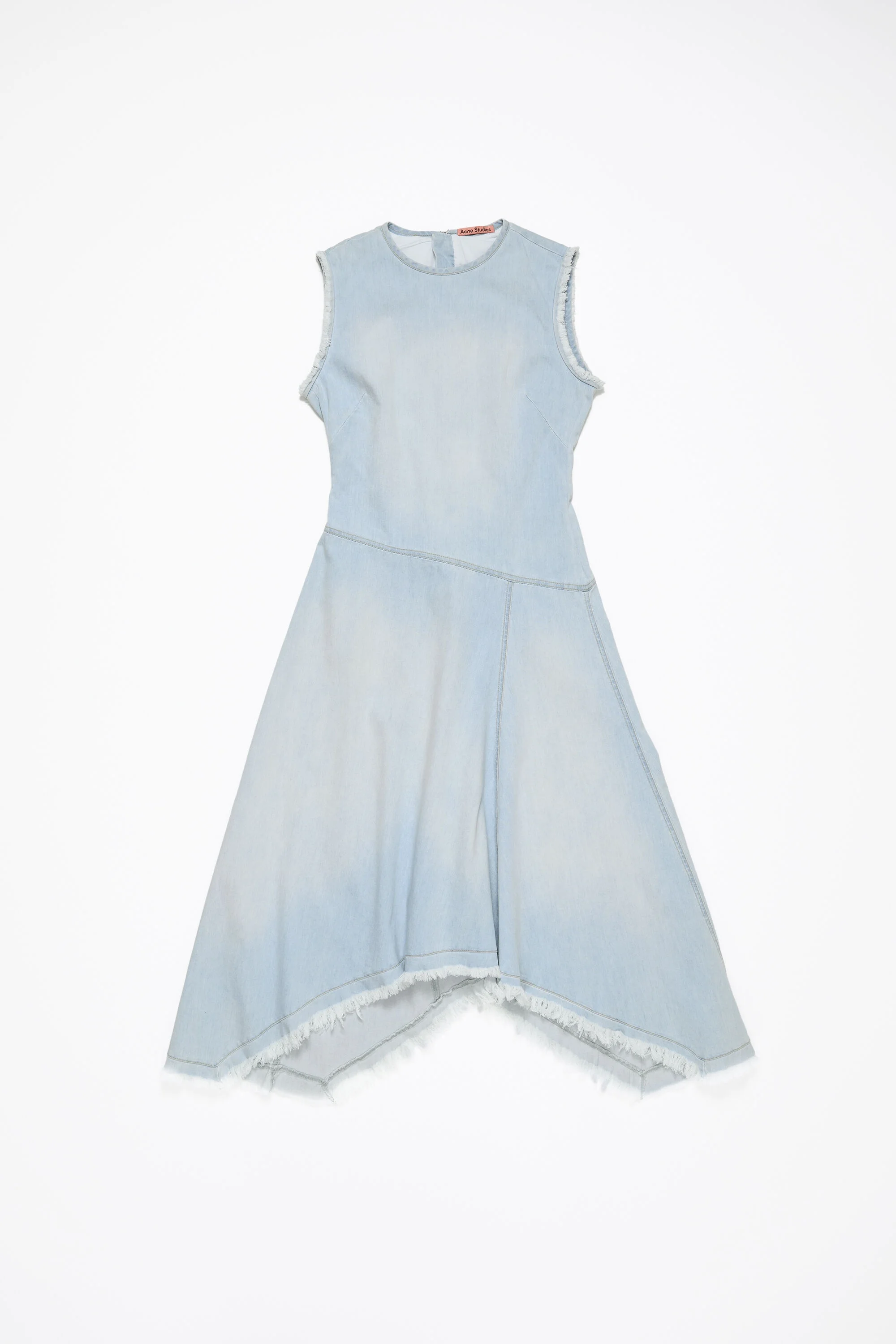 Draped sleeveless dress is crafted from power stretch denim with a vintage ice blue wash in regenerative cotton with raw edge finishing. Complete with centre back zip closure. Cut to a regular fit and mid-calf length with an irregular hem. - Regular fit - Asymmetric mid-calf length - Fluid draped skirt - Raw edge finishing - Centre back zipper closure - Female model is 178 cm / 5'10 and wears a size 36 - Style ID: FN-WN-DRES001488 - Shell: 97% Cotton, 3% Elastane, Lining: 96% Cotton, 4% Elastane