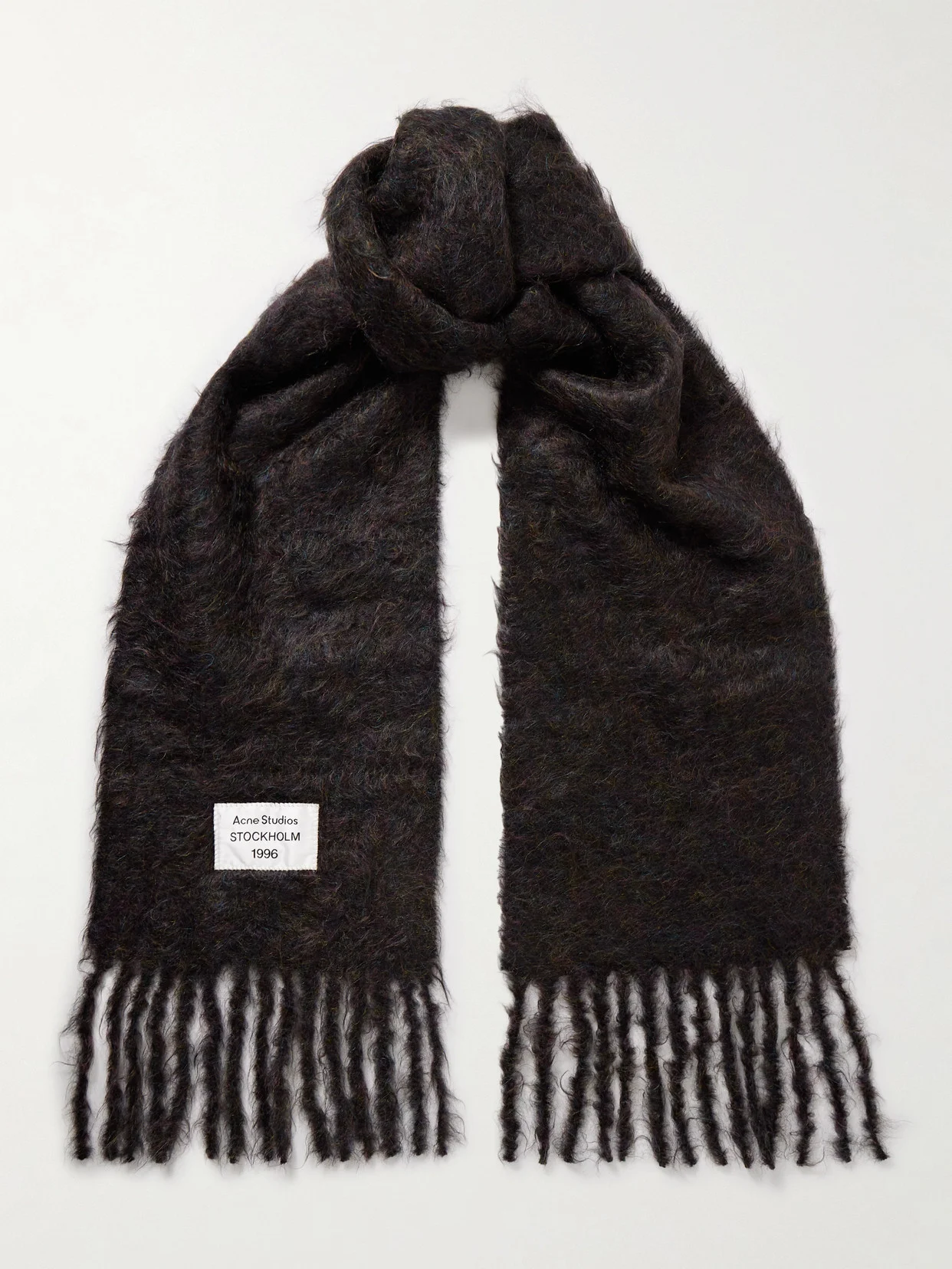 Acne Studios' signature scarves are defined by their oversized proportions and enveloping warmth. This version is made from a cozy brushed mohair-blend with a touch of wool and has fringed edges. The logo patch features the founding year and city. Lower-Impact Materials. This product is made using at least 50% lower-impact materials or ingredients. Find out more about our NET SUSTAIN criteria here.
