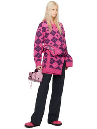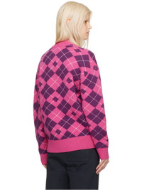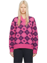 Brushed knit wool-blend sweater. Jacquard argyle pattern throughout. · Rib knit V-neck, hem, and cuffs · Embroidered logo patch at hem · Dropped shoulders Supplier color: Dusty pink/Lilac