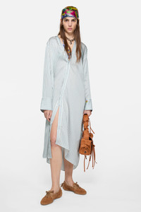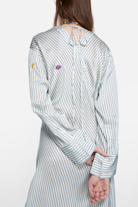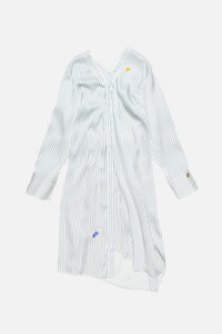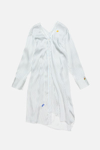 Long sleeve striped dress features an asymmetric design with a button-up closure throughout the body and neckline. Adorned with branded sticker-effect detailings. - Regular fit - Below knee length - V-neckline and back - Back tie-up closure - Asymmetric button-up closure - Branded sticker detailings - Model is 177 cm / 5'10 and wears a size 36 - Style ID: FN-WN-DRES001476 - Shell: 100% Preferred viscose