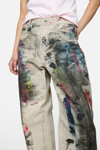 1981 jeans are cut to a baggy fit with a low waist, wide leg and long length. Adorned with a seasonal trompe l'oeil painted effect animation, crafted from cotton canvas. Each garment will vary. - Baggy fit - Low waist - Wide leg - Long length - Painted effect trompe l'oeil print - 5-Pocket construction - Button fly - Female model is 180 cm / 5′9" and wears a size Small/Regular, corresponds to size 36 and denim 27 - Male model is 188 cm / 6'2" and wears a size Small/Regular, corresponds to size 46 and denim 29 - Style ID: FN-UX-TROU000045 - Shell: 100% Cotton