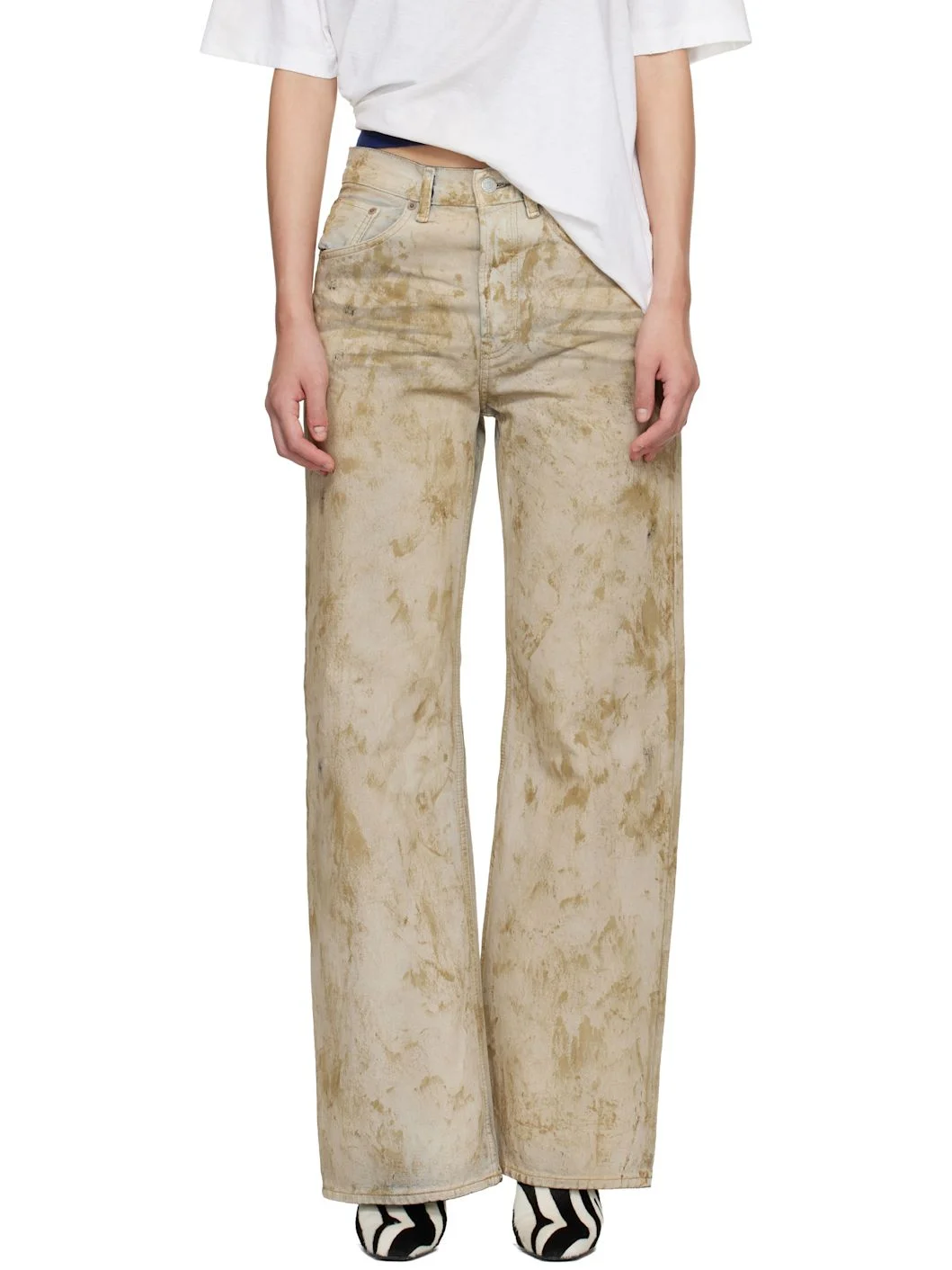 Wide-leg non-stretch denim jeans. · Fading, whiskering, discoloration, and paint splatter throughout · Mid-rise · Belt loops · Five-pocket styling · Button fly · Leather logo patch at back waistband · Logo-engraved silver-tone hardware Supplier color: Sand Beige Body: 100% cotton. Trim: 100% leather. Made in Italy 261129F069017