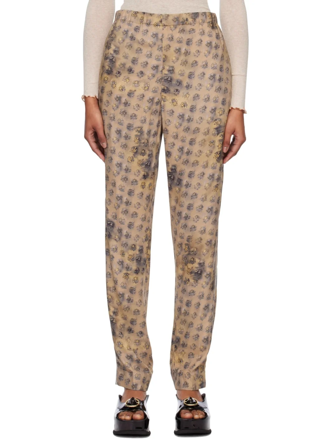 Viscose twill trousers. Floral pattern throughout. · Concealed drawstring at elasticized waistband · Three-pocket styling · Cupro satin trim at outseams Supplier color: Sand beige/Yellow Body: 100% viscose. Trim: 100% cupro. Made in Romania 231129F087034