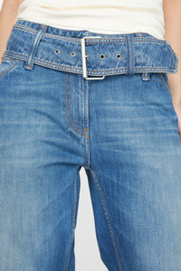 Denim trousers are cut to a relaxed fit with a low waist, wide leg and long length. Constructed with a matching belt and silver-toned buckle. Crafted non-stretch denim made of twill regenerative cotton blend in a mid-blue wash. - Relaxed Fit - Low Waist - Length – Long - Wide Leg - Denim buckle belt attached - Zipper Fly - Model is 180 cm / 5'11 and wears a size 36 - Style ID: FN-WN-TROU001408 - Shell: 56% Regenerative cotton, 44% Cotton, Patch: 100% Cow leather