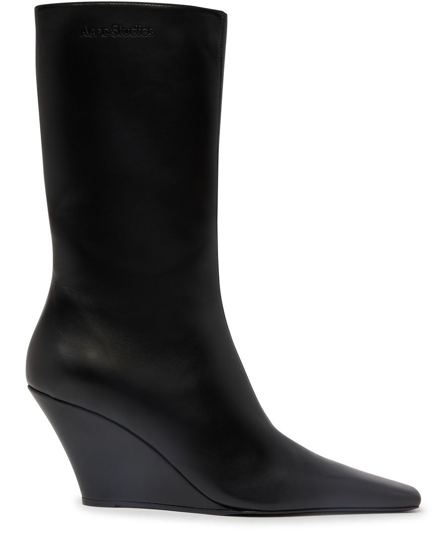 Acne's mid-heel boots feature a sleek, square toe design and a closed, pull-on style for easy wear. The high heel is balanced with a wedge heel for added comfort, making them perfect for everyday wear. These versatile boots are a must-have addition to any fashion-forward wardrobe. DESCRIPTION - square toe - boots - closed - pull-on design - high heel - wedge heel DETAILS AND CARE MATERIAL: Upper : 100% lamb leather, Lining : 100% lamb leather, sole : 80% calf leather, 20% rubber HEEL HEIGHT: 8 cm / 3.1 " COLOR: black COUNTRY OF MANUFACTURE: Italy PRODUCT CODE: ACNU528HBCKI21A100
