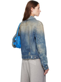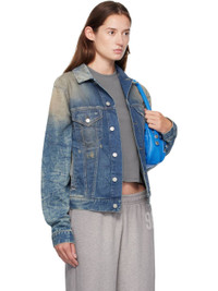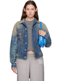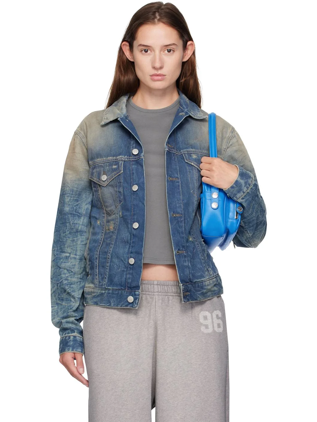 Non-stretch denim jacket. · Fading, whiskering, and distressing throughout · Spread collar · Button closure · Flap pockets at chest · Welt pockets at waist · Buttoned cuffs · Adjustable button tabs at back hem · Logo-engraved antiqued silver-tone hardware Supplier color: Mid blue 100% cotton. Made in Italy 252129F060008