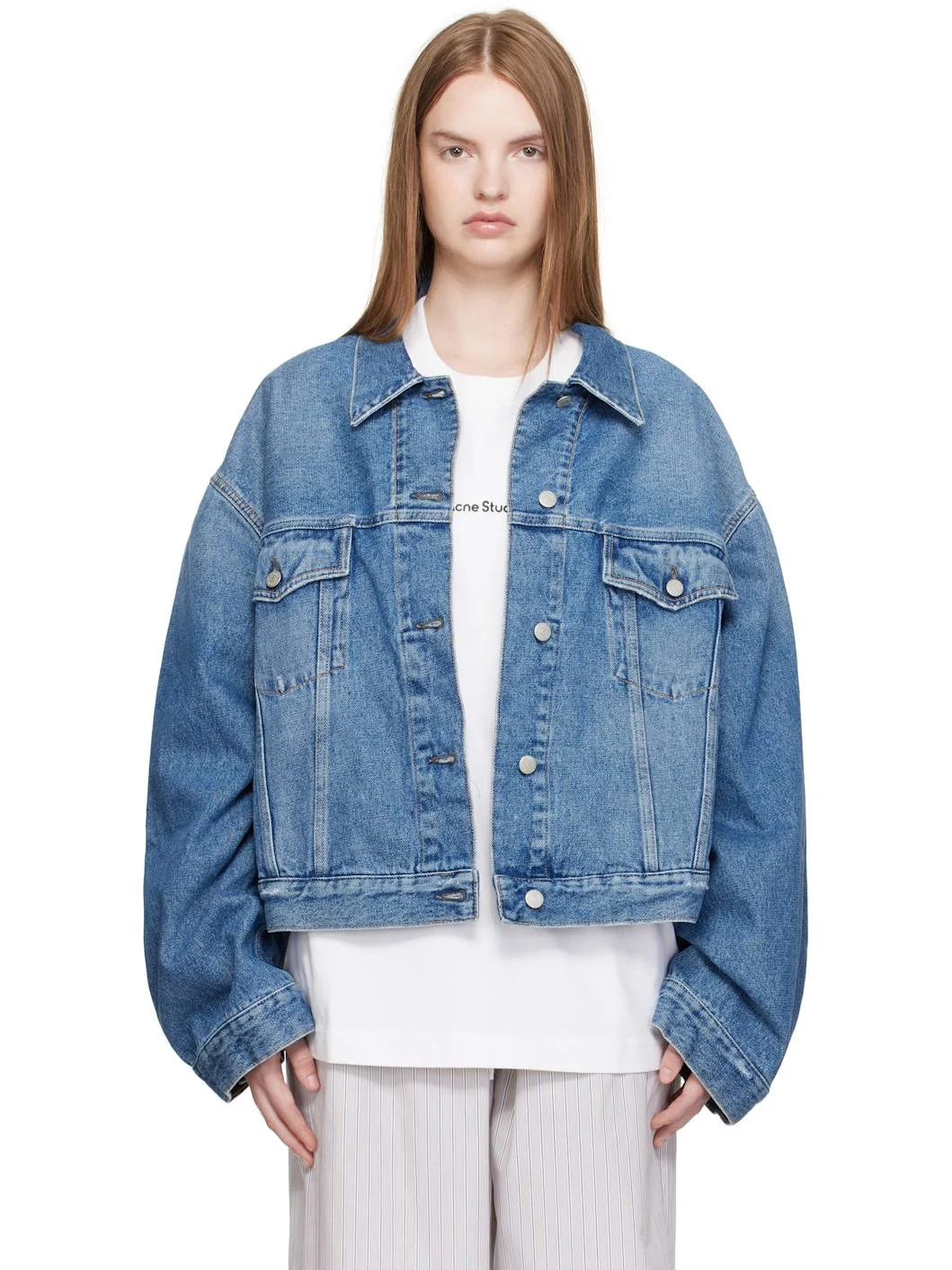 Non-stretch organic cotton denim jacket. · Fading throughout · Spread collar · Button closure · Flap pockets at chest · Welt pockets at waist · Dropped shoulders · Buttoned barrel cuffs · Locker loop at back collar · Adjustable button tabs at back hem · Logo-engraved antiqued silver-tone hardware · Contrast stitching in tan Supplier color: Mid blue 100% organic cotton. Made in Italy 252129F060000