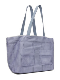 Cotton canvas tote in blue. · Trompe l'œil graphic printed throughout · Calfskin carry handles · Patch pocket and printed logo at face · Raw edge at sides and open throat · Zip pocket at interior · H12" x W21" x D7" Supplier color: Sky blue