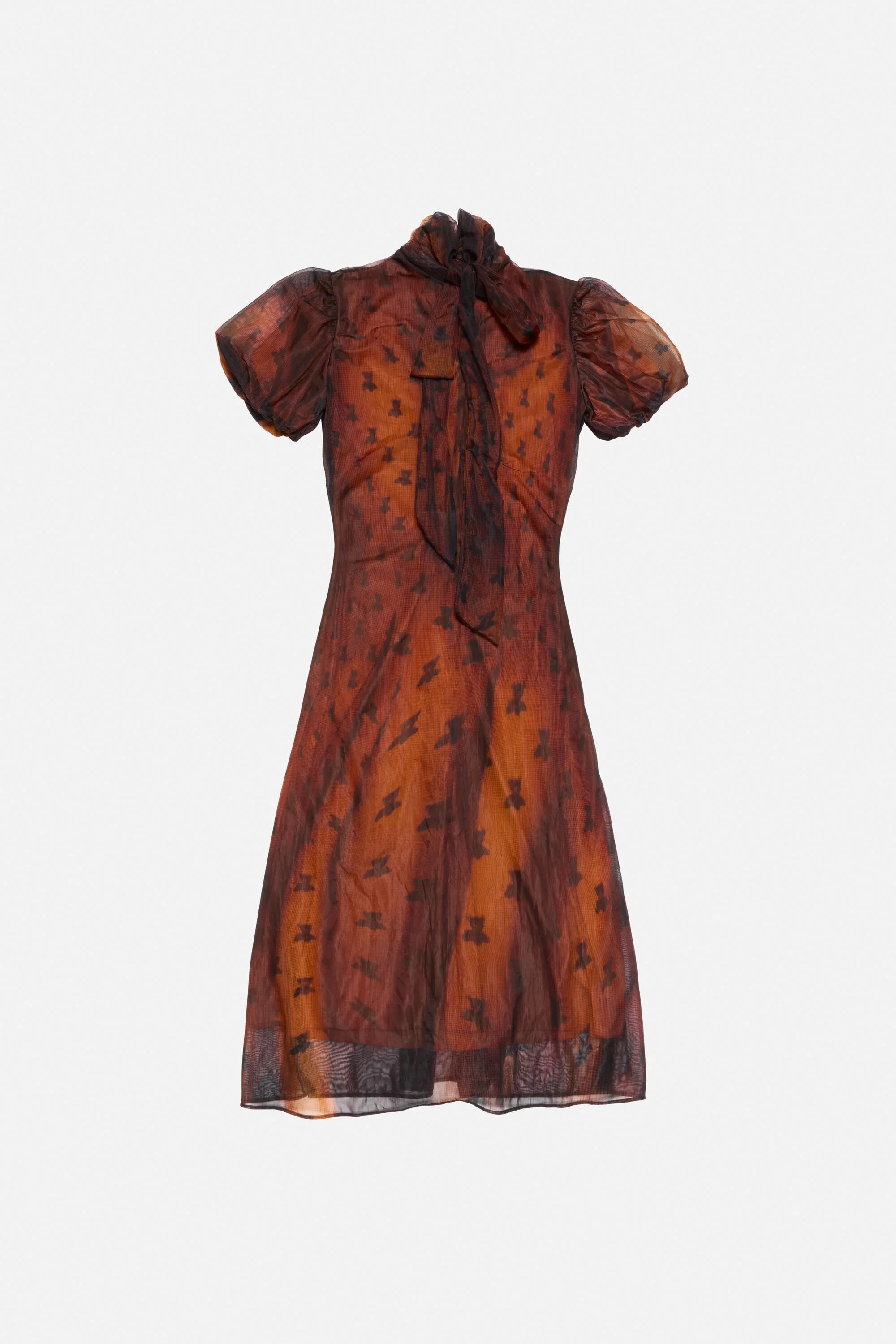 Short-sleeve dress featuring a bow construction, crafted from sheer, fluid fabric in rust brown with a seasonal printed pattern. Designed with gathered short sleeves—full through the middle and gathered at the top and cuffs. Finished with an invisible center back zip. Cut to a regular fit with a below-knee length. - Regular fit - Below-knee length - Bow construction on front - Short-sleeve gathered at the top and cuffs - Invisible center back zip - Model is 177 cm / 5'8 and wears a size 36 - Style ID: FN-WN-DRES001562 - Shell: 100% Nylon, Lining: 20% Elastane, 80% Nylon