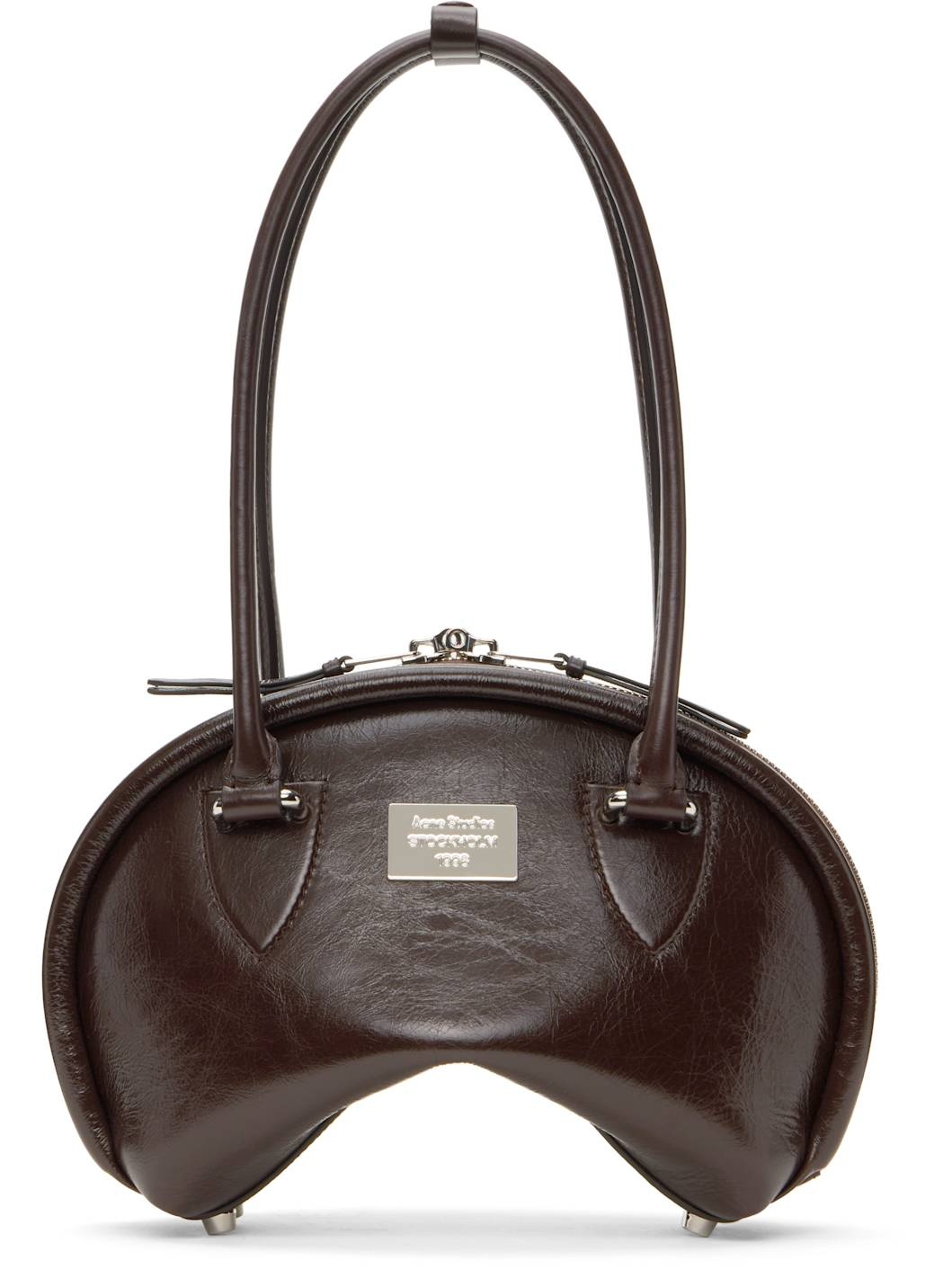 Grained calfskin top handle bag in brown. - Press-stud tab at rolled shoulder straps - Logo plaque at face - Logo-engraved padlock-style clasp at back face - Bumper studs at base - Two-way zip closure - Zip pocket at interior - Buffed faux-leather lining - Logo-engraved silver-tone hardware - H7 x W11 x D6 Supplier color: Chocolate brown