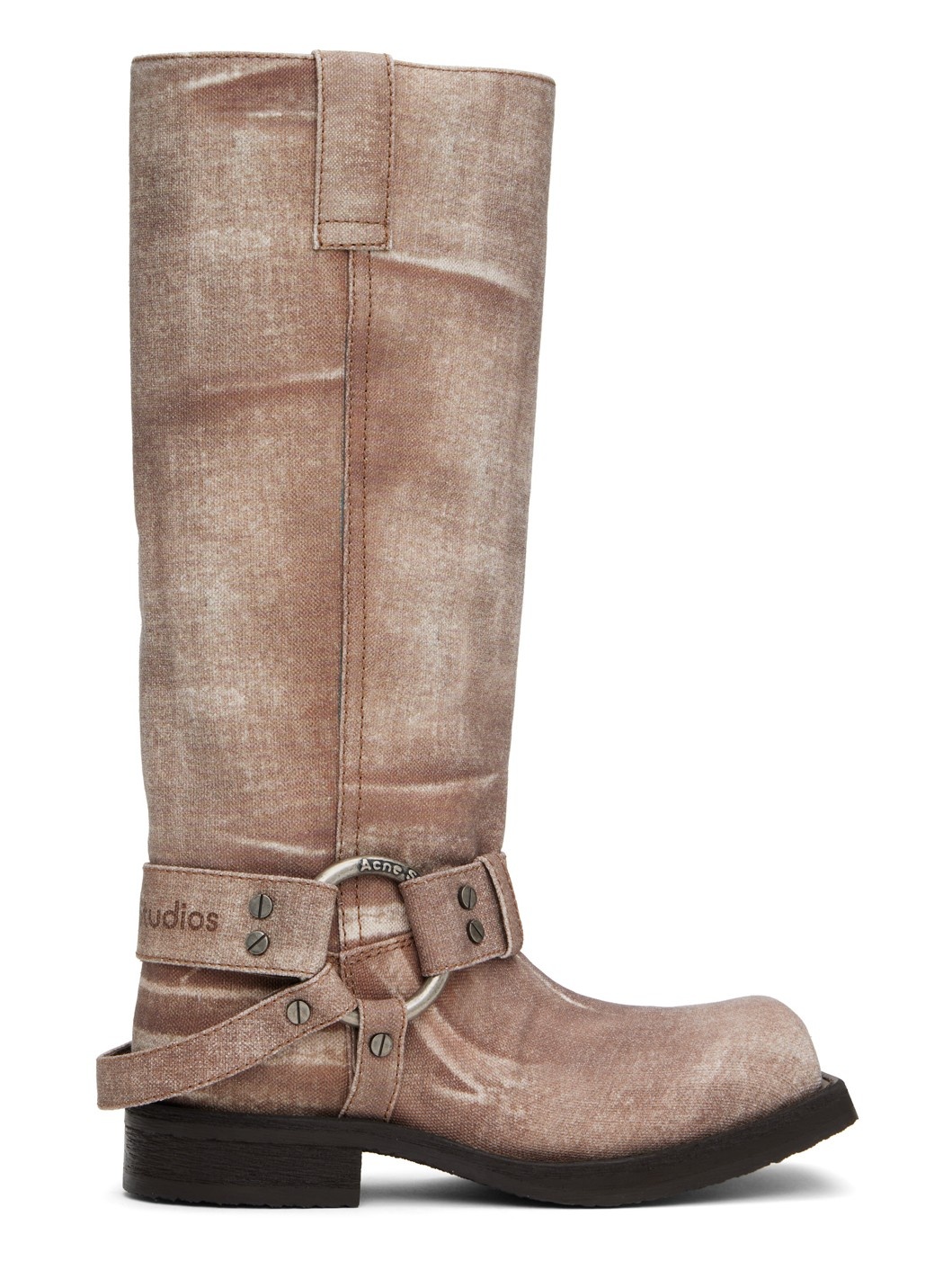 Mid-calf canvas boots in brown. · Acid wash effect throughout · Square toe · Pull-loops at collar · O-ring and logo embossed at ankle strap · Grained leather lining · Stacked leather block heel · Treaded crepe rubber sole · Logo-engraved antiqued silver-tone hardware Supplier color: Brown/White Upper: textile. Sole: rubber. Made in Italy 241129F115005