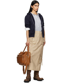 Grained calfskin shoulder bag in brown. · Fixed shoulder strap · Adjustable and detachable crossbody strap · Zip pockets at face · Logo-engraved key charm at zip pocket · Silver-tone logo stamp at face · Zip pocket at back face · Bumper studs at base · Two-way zip closure · Patch pocket at interior · Faux-leather lining · Logo-engraved silver-tone hardware · H11" x W16.5" x D4" Supplier color: Cognac brown Calfskin. Made in Italy 251129F048030