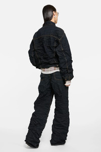 Denim jacket crafted from black mineral resin-coated denim with baked-in creases for a worn-in look—each piece is unique. Note: creases may soften over time. Features chest flap pockets, side seam pockets, and adjustable waist straps. Cut to a relaxed fit and hip length. - Relaxed unisex fit - Hip length - Baked-in creases - Chest flap pockets - Side seam pockets - Adjustable waist straps - Female model is 178 cm / 5'8 and wears a size XS - Male model is 187 cm / 6'2 and wears a size M - Style ID: FN-UX-OUTW000077 - Made with organically grown cotton - Shell: 100% Cotton