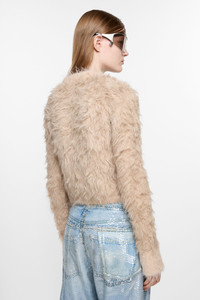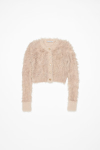 Button-up crew neck cardigan features a brushed hairy texture with ribbed finishes at the neckline, cuffs and hem. Cut to regular fit and cropped length. - Regular fit - Cropped length - Crew neck - Brushed textured finish - Button-up - Female model is 180 cm / 5′11″ and wears a size XS - Style ID: FN-WN-KNIT000802 - Made from recycled nylon. - Shell: 82% Nylon, 9% Wool, 8% Mohair, 1% Elastane