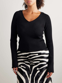 Acne Studios' ribbed-knit sweater is embellished with a silver-tone chain and heart-shaped charm that serves as a necklace, which can be detached if you're going for a simpler look. It has a slim fit and subtle leather trims along the shoulders. Size & Fit - Fits true to size, take your normal size - Designed for a slim fit - Lightweight knit - Model is 175cm/ 5'9" and is wearing a size Medium Model measurements: - Bust: 90cm/ 35.25" - Waist: 71cm/ 28" - Hip: 107cm/ 42" Details & Care - Black ribbed-knit and leather - Slips on - 77% viscose, 20% nylon, 3% elastane - Hand wash