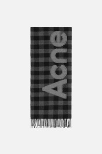 Fringed scarf crafted from a rich wool blend, featuring an all-over check pattern and a contrasting jacquard-woven fil coupe Acne Studios logo. - Check pattern - Acne Studios logo - Fringed ends - Measurements: 37 cm; 205 cm - Style ID: FN-UX-SCAR000297 - Certified to the Responsible Wool Standard (RWS) by Control Union, license number CU-1024001 - Shell: 95% Wool, 5% Nylon