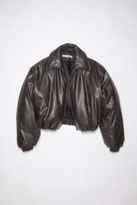Acne Studios dark brown bomber jacket is detailed with a centre front zipper closure and ribbed cuffs. Complete with side pockets and filled with down. Cut to a regular fit with a below waist length. - Regular fit - Below waist length - Down filling - Zipper closure - Ribbed cuffs - Side pockets - Model is 180 cm / 5′9″ and wears a size 36 - Style ID: FN-WN-OUTW000721 - Shell: 55% Polyester, 45% Polyurethane, Lining: 100% Viscose, Pocket Lining: , Filling: