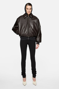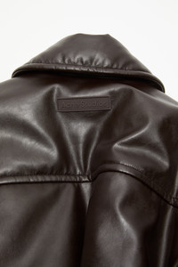 Bomber jacket features a coated leather finish, complete with a zippered closure, side pockets, and Acne Studios logo patch on the back. Cut to a relaxed fit with dropped shoulders and hip length. - Relaxed fit - Hip length - Dropped shoulders - Acne Studios logo patch - Side pockets - Ribbed cuffs - Fully lined - Model is 178cm/ 5'10 and wears a size 36 - Style ID: FN-WN-OUTW000878 - Shell: 55% Polyester, 45% Polyurethane, Lining: 100% Viscose