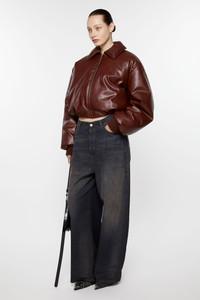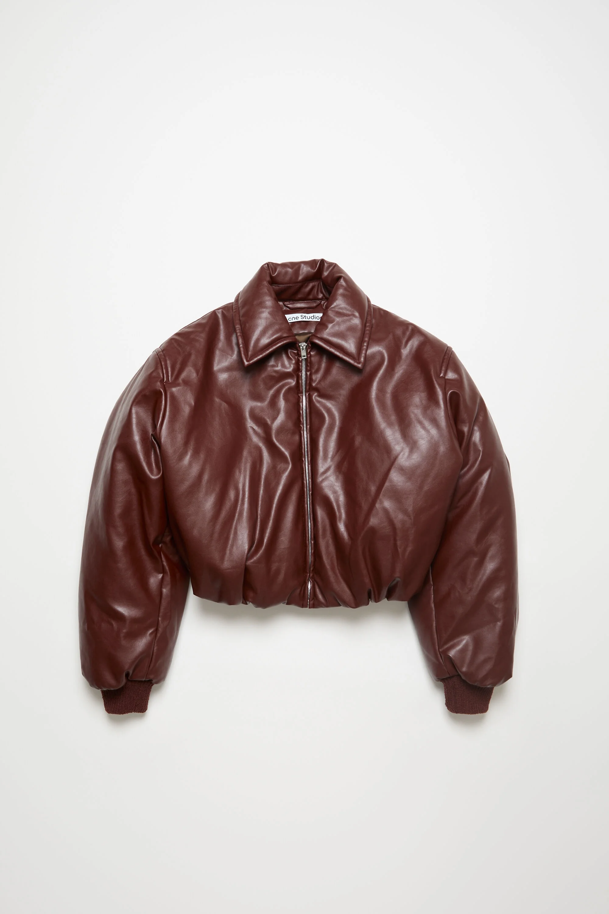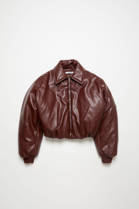 Bomber jacket features a coated leather finish, complete with a zippered closure, side pockets, and Acne Studios logo patch on the back. Cut to a relaxed fit with dropped shoulders and hip length. - Relaxed fit - Hip length - Dropped shoulders - Acne Studios logo patch - Side pockets - Ribbed cuffs - Fully lined - Model is 180 cm / 5′11 and wears a size 36 - Style ID: FN-WN-OUTW000878 - Shell: 100% Polyester, Coating: 100% Polyurethane, Lining: 100% Viscose, Pocket Lining: 100% Cotton, Filling: