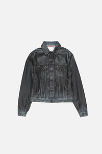 Denim jacket features a pressed black leather finish on washed indigo Tencel denim. Unlined, it is designed with a center-front branded button closure, chest pockets, and welt pockets. Cut to a regular fit with waist length. - Denim jacket - Regular fit - Waist length - Pressed black leather finish - Branded button closure - Chest pockets - Welt pockets - Model is 186 cm / 6'1 and wears a size Small - Style ID: FN-UX-OUTW000104 - Shell made with organic cotton - Shell: 40% Lyocell, 60% Cotton