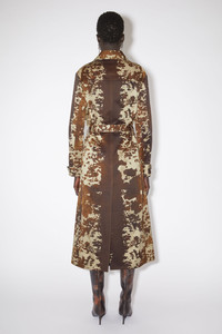Acne Studios dark brown belted double-breasted trench coat features an all-over print, crafted from cotton. Complete with a button closure and welt pockets. Cut to a regular fit with a mid-length. - Regular fit - Mid-length - Double-breasted - Front button closure - Belted - All-over print - Welt pockets - Fully lined - Model is 179 cm / 5′11 and wears a size 36 - Style ID: FN-WN-OUTW000828 - Shell: 100% Cotton, Lining: 100% Viscose
