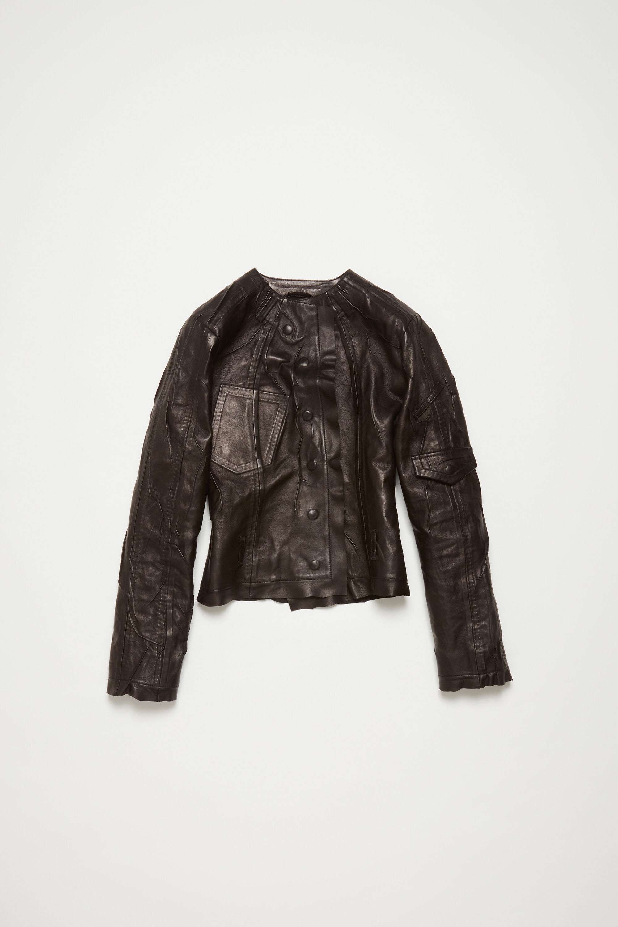 Jacket is cut to a fitted fit and below waist length. Crafted from double-bonded leather with a creased finish. Complete with a hidden button closure and flap sleeve pocket. - Fitted fit - Below waist length - Collarless - Creased leather - Hidden button closure - Flap sleeve pocket - Fully lined - Model is 177 cm / 5′10 and wears a size 36 - Style ID: FN-WN-LEAT000346 - Shell: 100% Lamb leather, Lining: 100% Viscose, Backing: 100% Cotton
