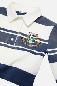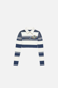 Long sleeve top features varsity-inspired details, a seasonal logo, and bold stripes with a fade-out finish. Cute with a fitted silhouette and ultra-cropped length. - Fitted - Polo collar - Ultra-cropped - Button closure - Seasonal logo - Model is 178 cm / 5'8" and wears a size S - Style ID: FN-WN-TSHI000757 - Made with organically grown cotton - Shell: 2% Elastane, 98% Cotton