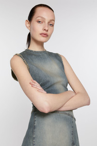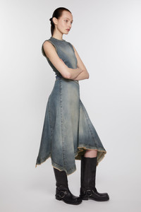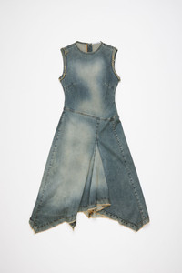 Draped sleeveless dress is crafted from power stretch denim with a vintage wash finish and raw edge details. Cut to a regular fit and mid-calf length with an irregular hem. - Regular fit - Mid calf length with irregular hem - Sleeveless - Pleated and draped skirt - Invisible zipper closure at the back - Model is 180cm/ 5'11 and wears a size 36 - Style ID: FN-WN-DRES001300 - Shell: 97% Cotton, 3% Elastane