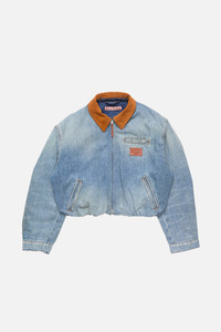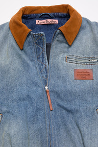 Denim bomber blouson jacket crafted from organic cotton denim with fading and subtle whiskers. Features a suede collar, welt pockets with hidden zips, a gathered waist, and a logo leather patch on the chest. Cut to a regular fit. - Regular fit - Faded effect with subtle whiskers - Suede collar - Welt pockets with hidden zips - Gathered waist - Logo leather patch on chest - Model is 177 cm / 5'8 and wears a 36 - Style ID: FN-WN-OUTW001176 - Made with organically grown cotton - Shell: 40% Lyocell, 60% Cotton, Lining: 100% Cotton, Filling: 100% Polyester, Collar: 100% Cow leather, Patch: 100% Cow leather