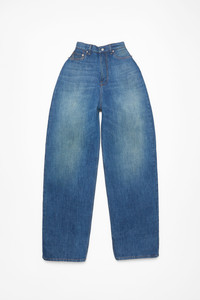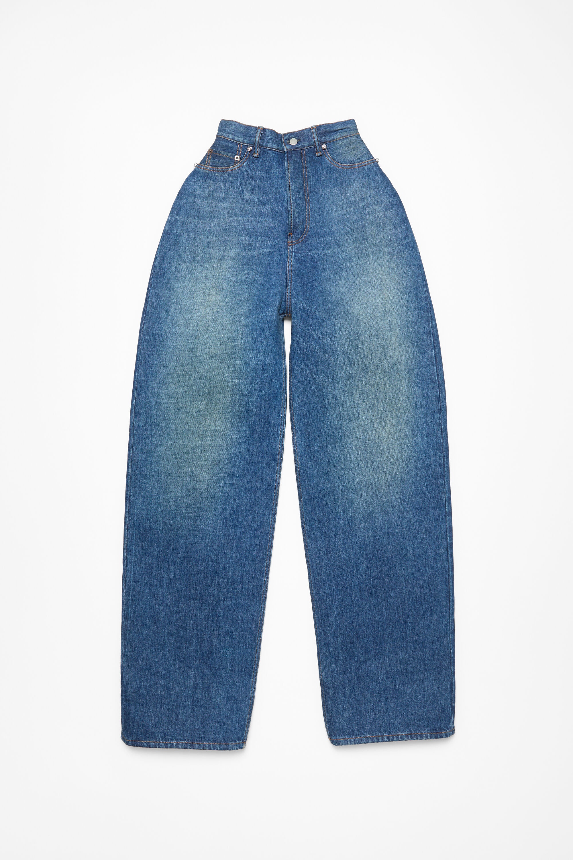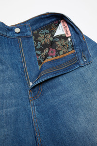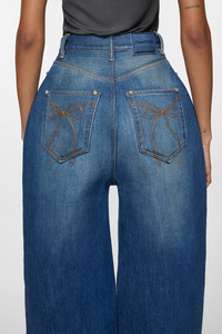 Denim trousers are crafted in non-stretch regenerative cotton denim in a vintage ice blue wash. Characterised by a bonded construction with a seamless sculptural design. The 5-pocket style trouser is adorned with bow embroideries at the back pockets. Cut to a loose fit with a high waist, and extra long length. - Loose fit - High waist - Extra long length - Bonded construction - 5-pocket - Model is 180 cm / 5'11 and wears a size 36 - Style ID: FN-WN-TROU001350 - Shell: 56% Regenerative cotton, 44% Cotton, Backing: 100% Polyurethane, Lining: 100% Polyester