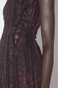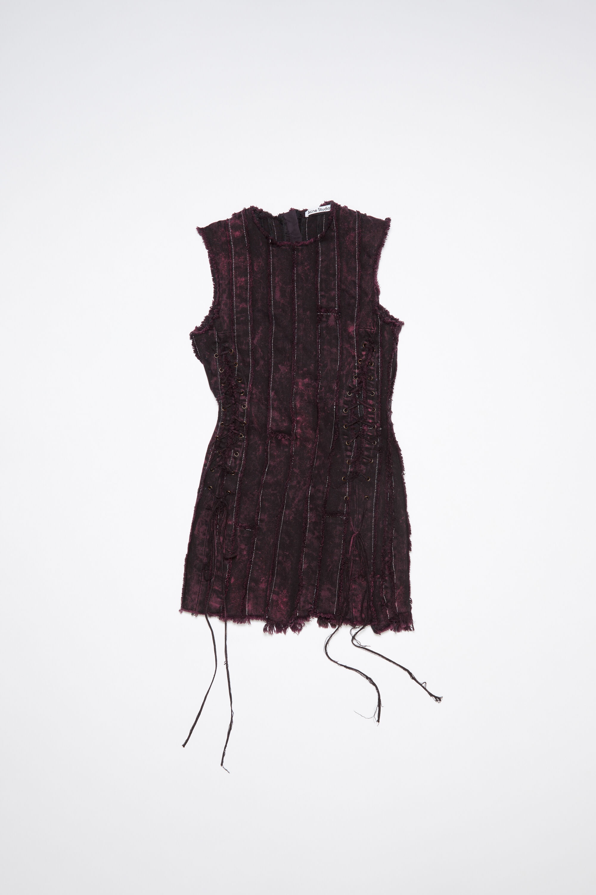 Acne Studios black/wine red sleeveless dress is crafted from denim with bleached and striped patchwork with raw edges. Complete with side seam lacing all over the body. Cut to a fitted silhouette with an above the knee length. - Fitted fit - Above the knee length - Sleeveless - Patchwork stripes with raw edges - Bleached and garment-dyed finish - Side seam lacing opening - Model is 179 cm / 5′11 and wears a size 36 - Style ID: FN-WN-DRES001079 - Shell: 100% Cotton