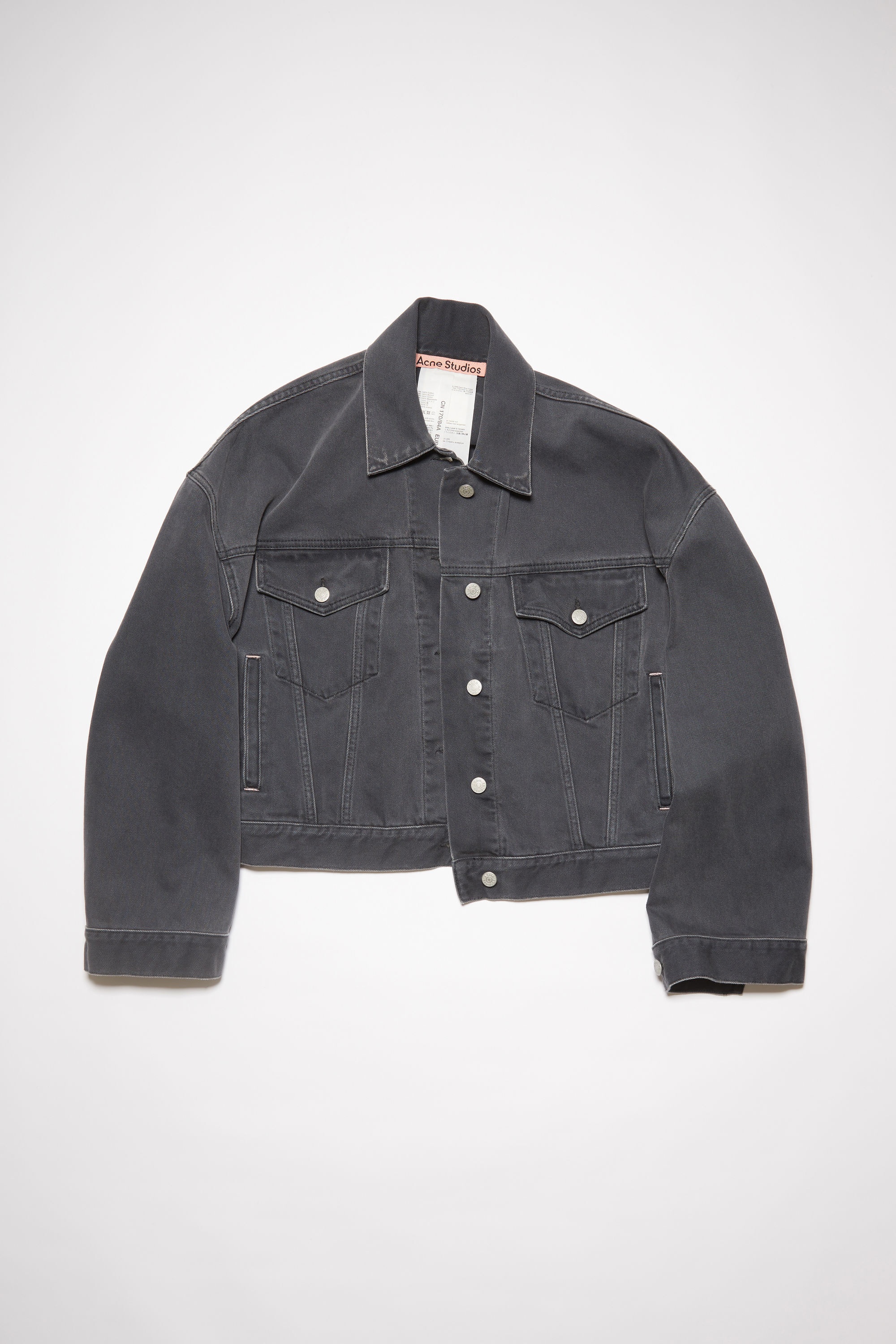Acne Studios dark grey denim jacket features a loose fit with elongated sleeves and hem length. Crafted from rigid denim made of cotton. - Loose fit - Elongated sleeve length - Elongated hem length - Rigid denim - Button closure - Welt pockets - Unlined - Model is 180cm/6'0 and wears a size 36 - Made in Italy - Style ID: FN-WN-OUTW000514 - Main material made from organically grown cotton - Main material: 100% organic cotton