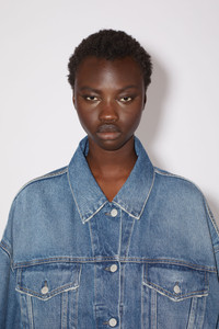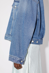 Denim jacket is cut to a relaxed fit with dropped shoulders, extra long sleeves and a cropped length. Crafted from non-stretch denim in a mid-blue wash. - Relaxed fit - Cropped length - Dropped shoulders - Extra long sleeves - Button-up closure - Model is 179 cm / 5′11 and wears a size 36 - Style ID: FN-WN-OUTW000514 - Made from organically grown cotton. - Main material: 100% organic cotton