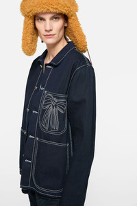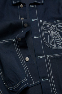 Jacket crafted from indigo denim with a workwear-inspired look. Features a button closure and front patch pockets, finished with embroidered seasonal bow artwork on the chest pocket. Cut to a regular fit and hip length. - Regular fit - Hip length - Button-up closure - Patch pockets - Embroidered seasonal bow artwork - Female model is 178 cm / 5'8 and wears a size 36 - Male model is 189 cm / 6′2 and wears a size 46 - Style ID: FN-UX-OUTW000087 - Made from organically grown cotton - Shell: 100% Cotton