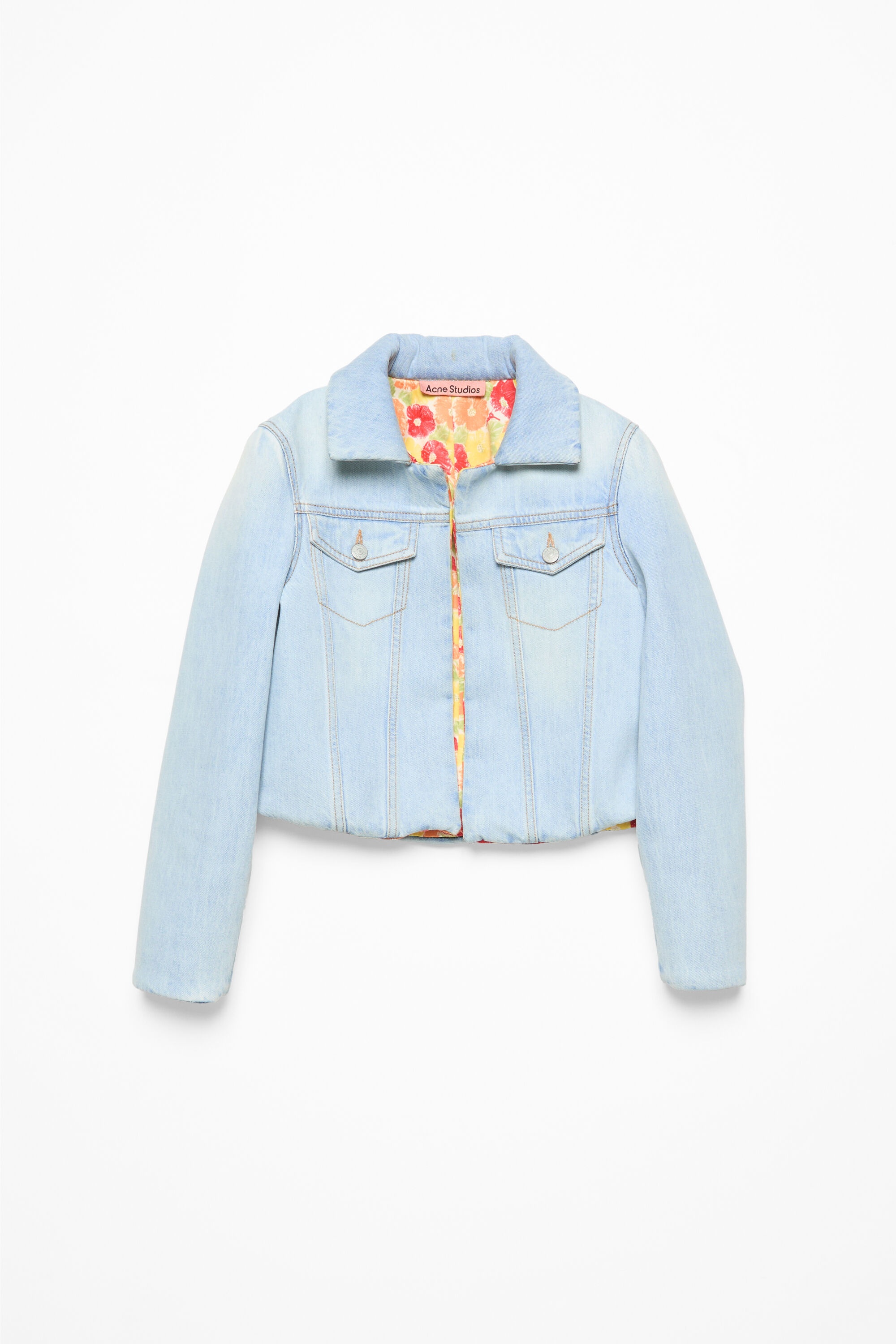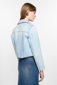 Denim jacket features a bonded construction with soft padding for a seamless sculptural design. Crafted from a non-stretch regenerative cotton in vintage ice blue wash. Detailed with decorative pockets with rivet buttons at the chest. Cut to a regular fit with a cropped length. - Regular fit - Waist length - Decorative chest pockets - Fully lined - Model is 179 cm / 5'11 and wears a size 36 - Style ID: FN-WN-OUTW001058 - Shell: 56% Regenerative cotton, 44% Cotton, Backing: 100% Polyurethane, Lining: 100% Polyester