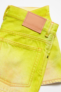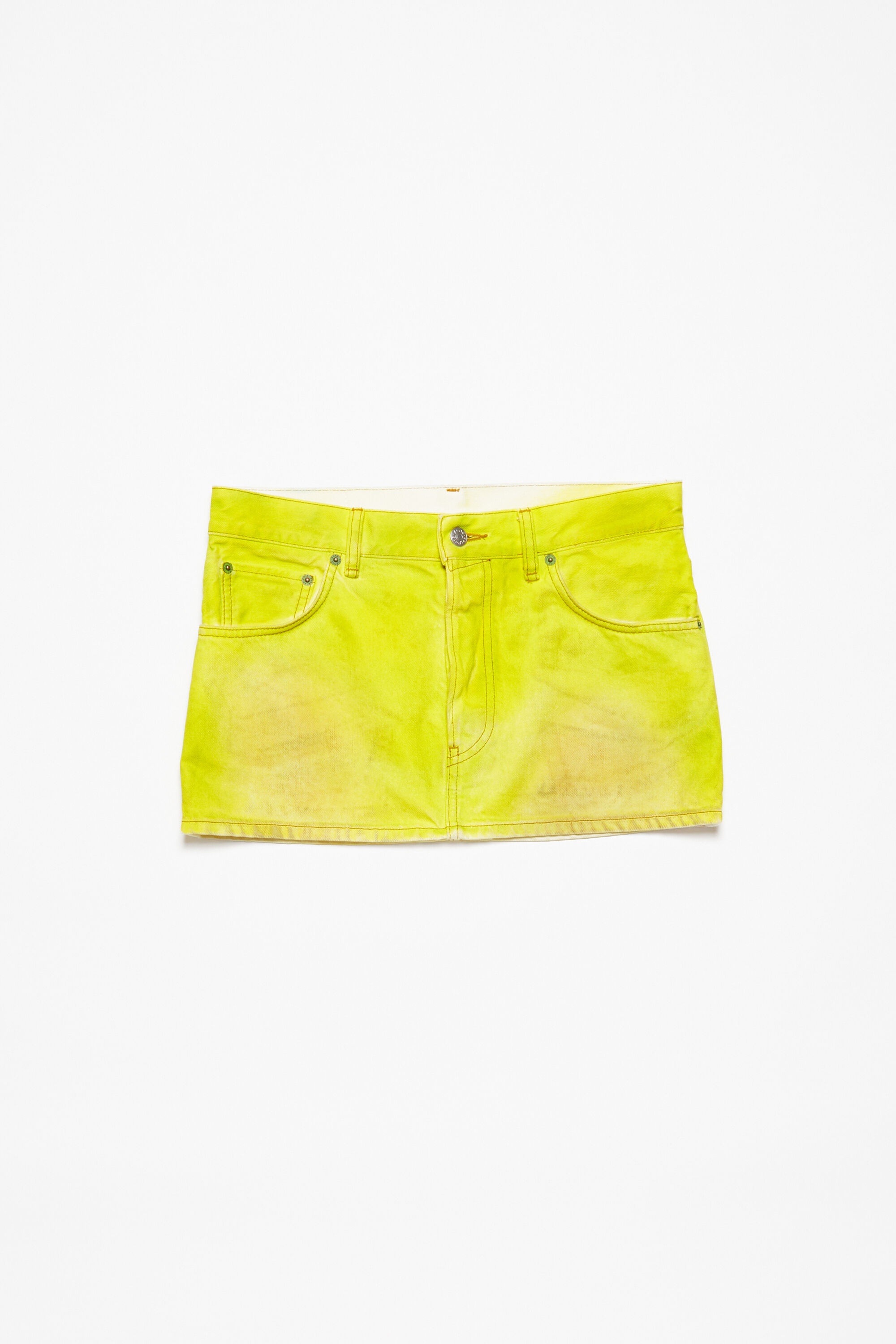 Mini skirt is cut to a regular fit with a straight shape, low waist and mini length. Crafted from non stretch denim in a neon yellow wash with a shiny coated finish and all–over smudge detail. - Regular fit - Straight shape - Low waist - Mini length - 5-Pocket denim construction - Model is 181 cm / 6' and wears a size 36 - Style ID: FN-WN-SKIR000642 - Shell: 100% Cotton, Pocket Lining: 65% Polyester, 35% Cotton