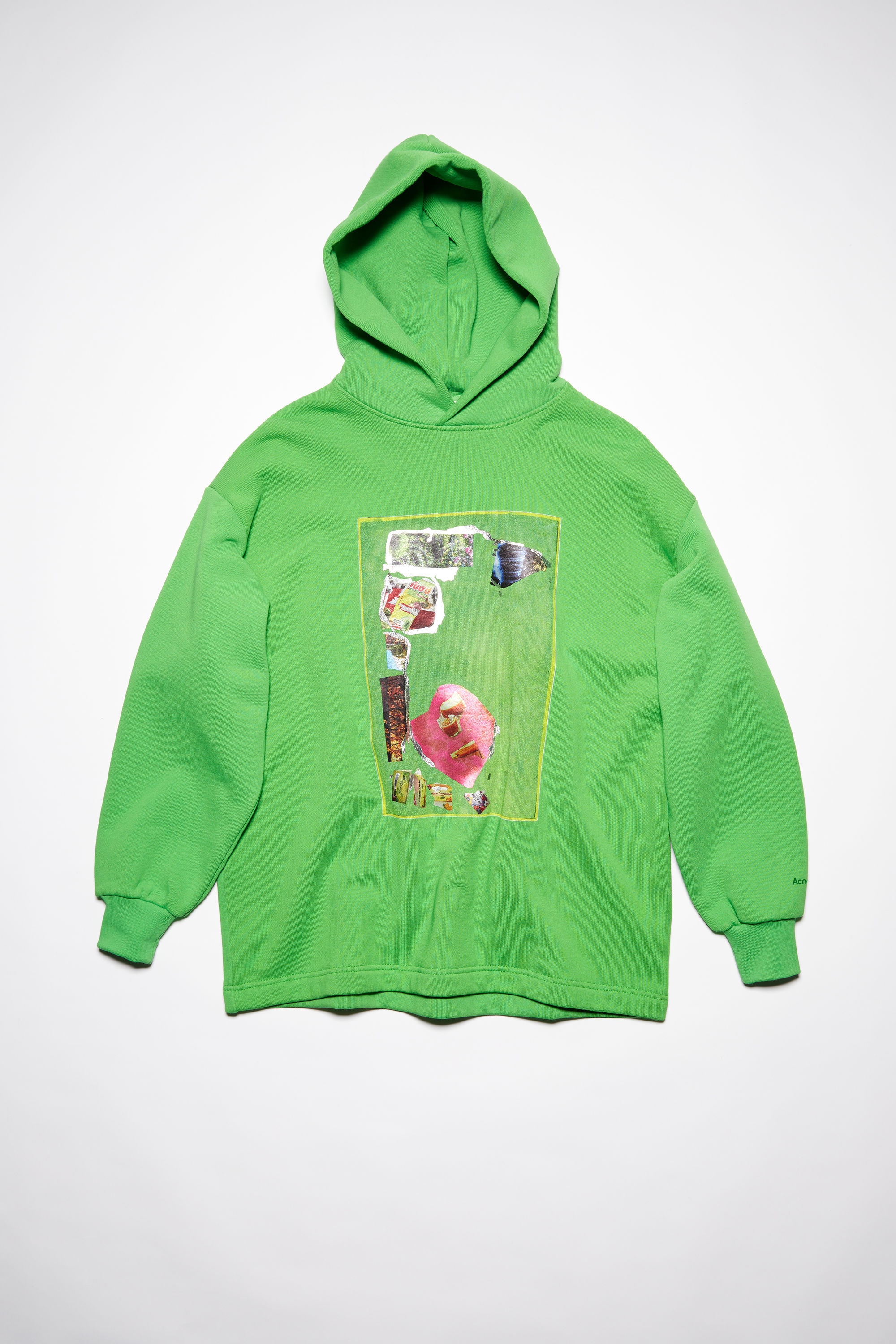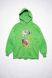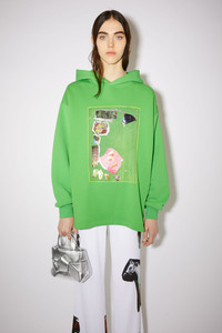 Acne Studios green hooded sweatshirt features a digital print artwork by artist Martin Laborde. Crafted from midweight fleece made from organically grown cotton and cut to a loose fit with a long length. - Midweight brushed fleece - Hooded - Bonded satin and foil digital print by artist Martin Laborde - Ribbed cuffs - Acne Studios logo on the back - Style ID: FN-WN-SWEA000197 - Loose fit - Below the hip length - Model is 178 cm / 5’10” and wears a size S - Shell: 100% Cotton