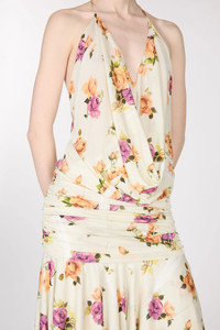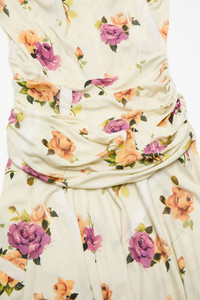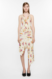 Dress features a seasonal print with a gathered design, asymmetric skirt and extra gathered panelling at the hips. Complete with a cross-over cowl neckline and strap closure. Crafted in a fluid jersey fabric. Cut to a regular fit, draped asymmetric hem and short length. - Regular fit - Strap - Asymmetric hem - Cowl neckline - Gathered details - Model is 179 cm / 5'11 and wears a size 36 - Style ID: FN-WN-DRES001443 - Shell: 100% Viscose