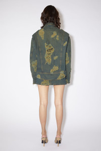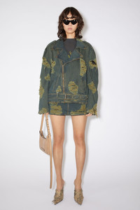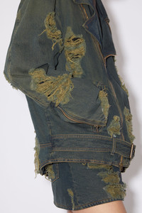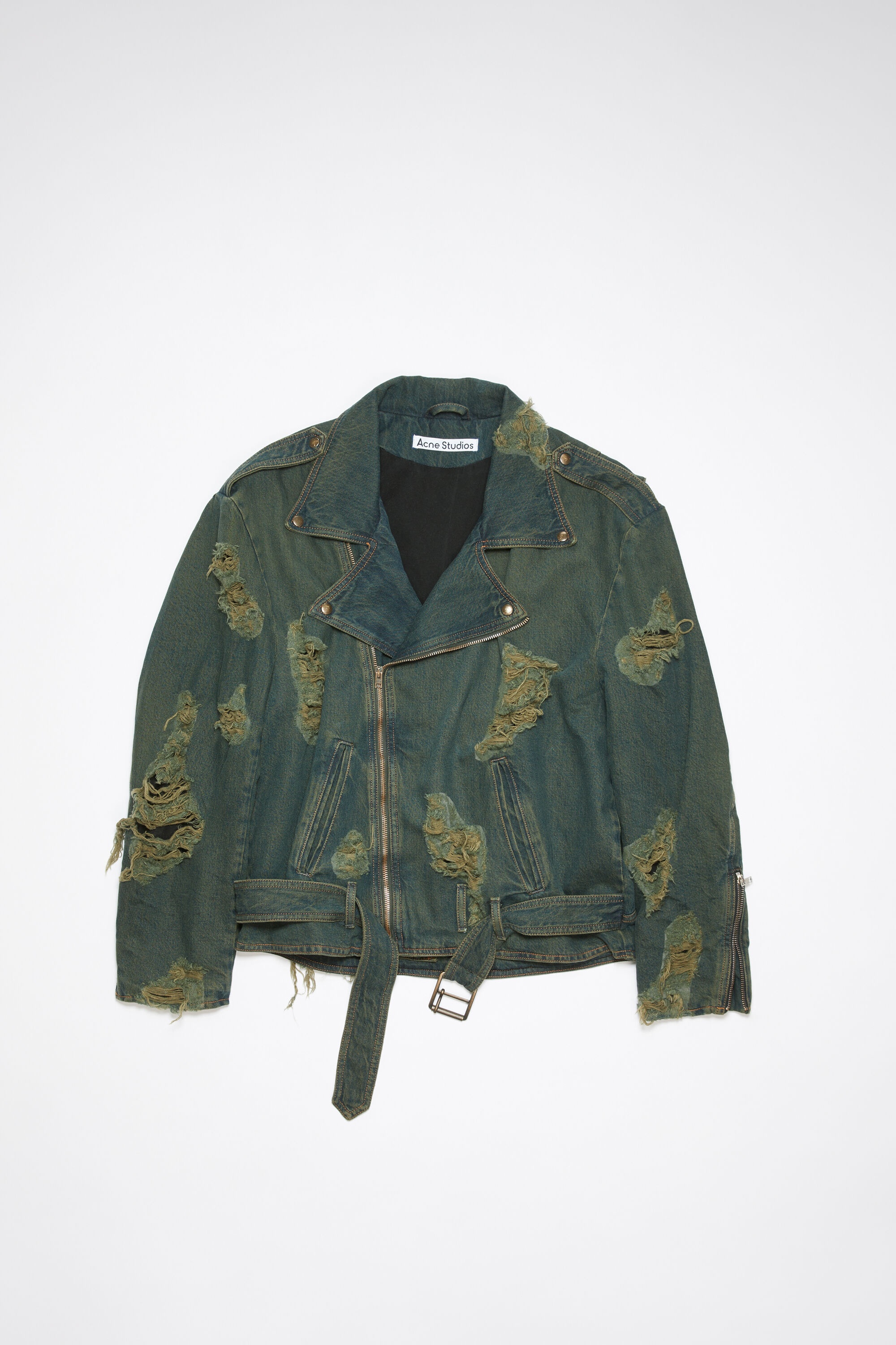 Acne Studios blue/green denim biker jacket is crafted from cotton twill with warp yarn dyed in pure indigo with a stonewashed and overdyed finish. Detailed with distressed holes, biker details, zipper closure and pockets. Cut to an exaggerated fit with elongated sleeves below the hip length. - Exaggerated fit - Below the hip length - Elongated sleeves - Double-breasted zip closure - Zippered front pockets - Biker details - Dyed denim with distressed holes - Fully lined - Model is 178 cm / 5′10 and wears a size 36 - Style ID: FN-WN-OUTW000810 - Main material made with 75% organically grown cotton and 25% recycled cotton. - Shell: 100% Cotton, Lining: 65% Polyester, 35% Cotton