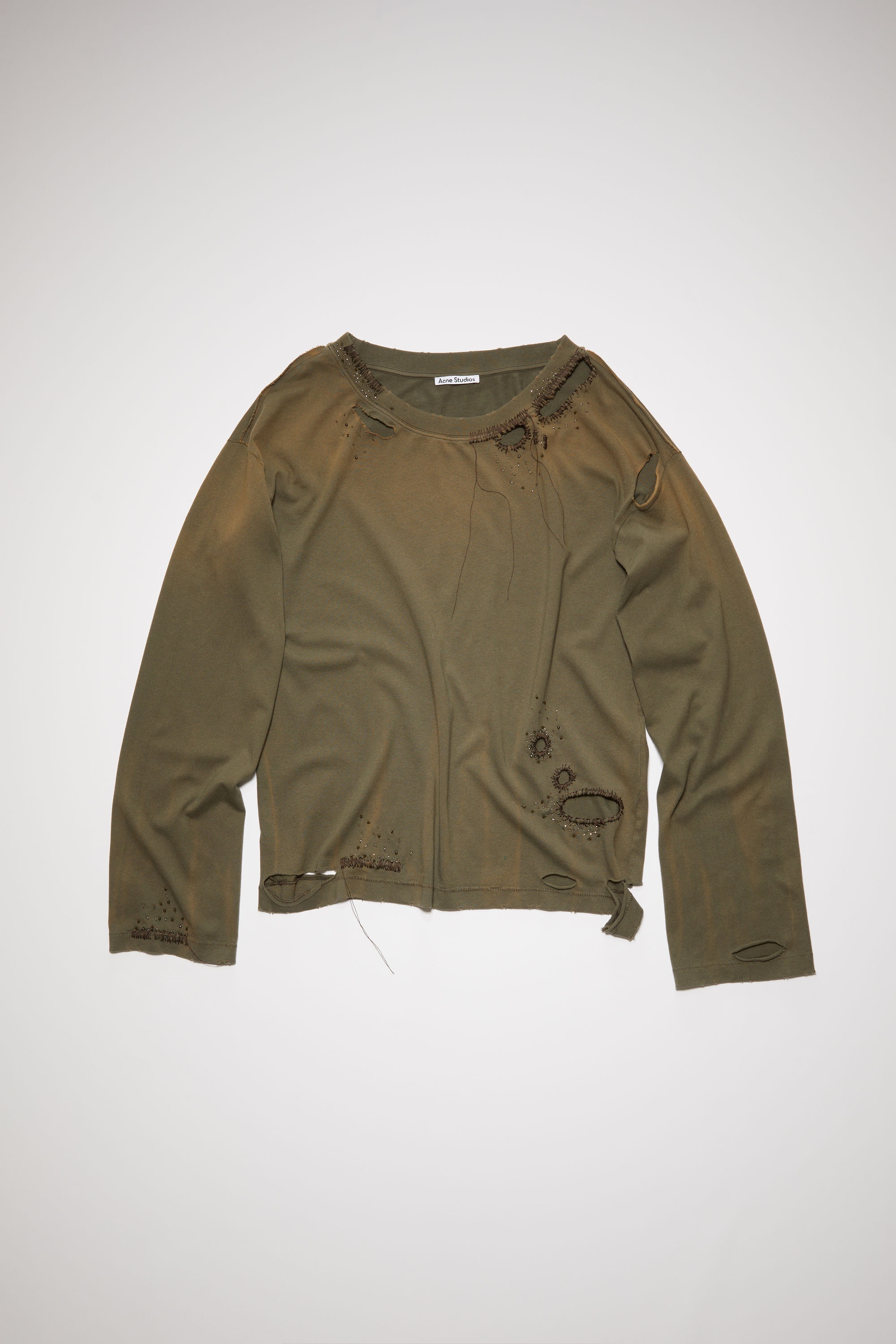 Acne Studios dusty brown long sleeve t-shirt features a faded dyed jersey, detailed with distressed details and embroidered beads. Crafted from organically grown cotton and cut to an oversized fit. - Faded dyed jersey - Distressed details on the neckline, body, hem and cuffs - Embroidered beads - Ribbed neckline - Style ID: FN-WN-TSHI000504 - Oversized fit - Below the hip length - Model is 179 cm/5'8 and wears a size M - Shell: 100% Cotton