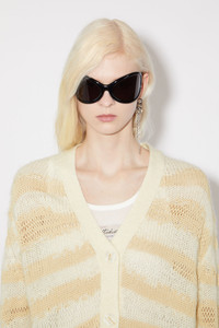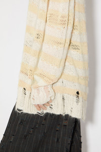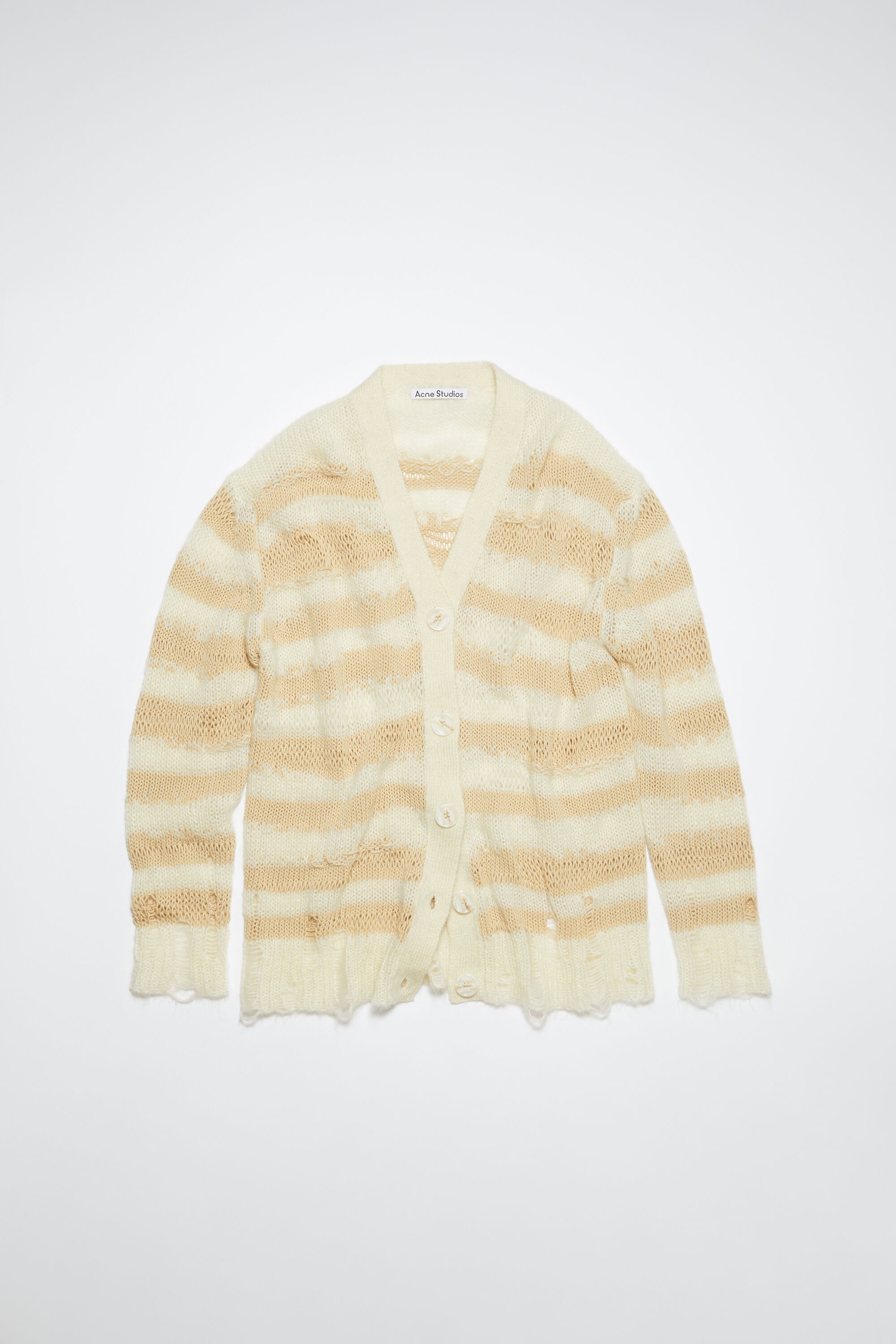 Acne Studios off white/ecru cardigan features an all-over stripe pattern, detailed with a v-neckline and a centre front button-up closure. Adorned with irregular stitching and distressed details on the cuffs and hem. Cut to a relaxed fit with a hip length. - Relaxed fit - Hip length - V-neckline - Button-up closure - Stripe pattern - Irregular stitching - Distressed details on the cuffs and hem - Model is 178 cm / 5′10″ and wears a size S - Style ID: FN-WN-KNIT000535 - Made from organically grown cotton and recycled nylon. - Shell: 46% Cotton, 17% Acrylic, 15% Nylon, 14% Mohair, 8% Wool