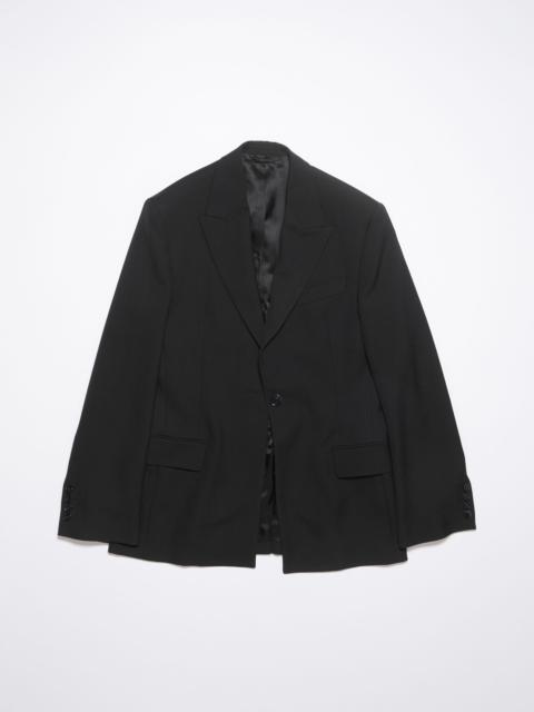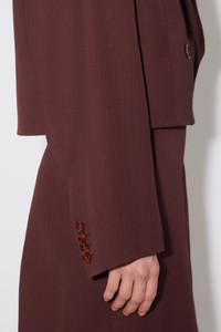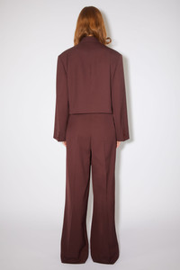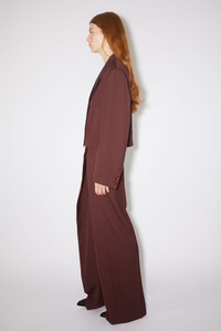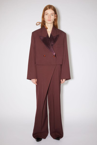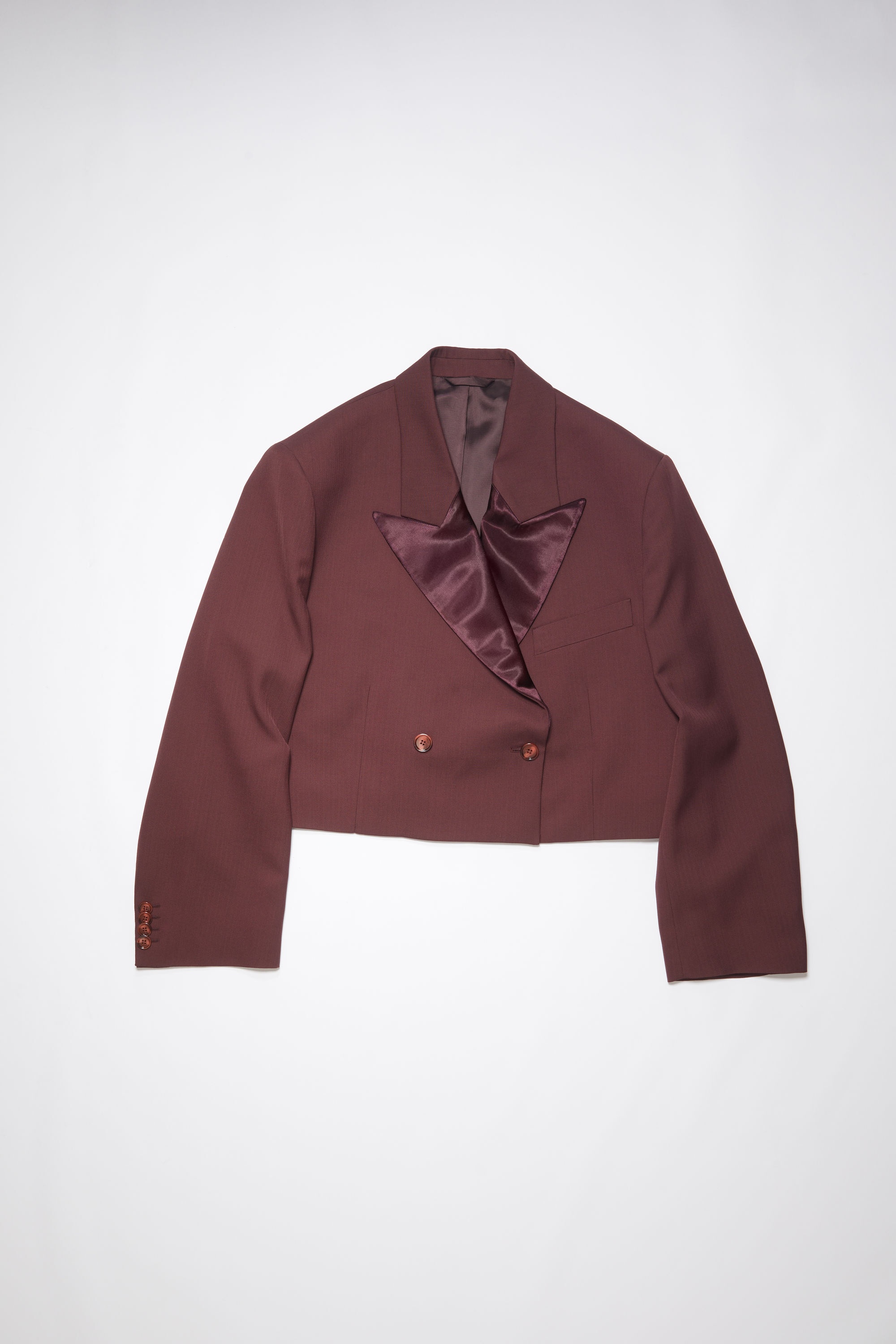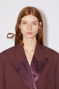Acne Studios aubergine purple double-breasted suit jacket is crafted from a wool blend and features a contrast satin lapel. Complete with a welt chest pocket, cut to a relaxed fit and waist length. - Relaxed fit - Waist length - Double-breasted - Button-up closure - Welt chest pocket - Contrast satin lapel - Fully lined - Model is 178 cm / 5'8 and wears a size 36 - Style ID: FN-WN-SUIT000448 - Shell: 55% Polyester, 45% Wool, Lining: 100% Viscose, Contrast: 100% Acetate