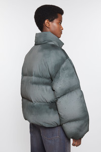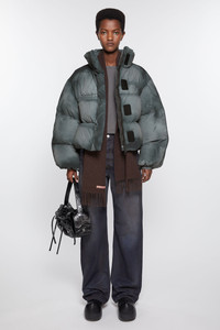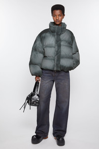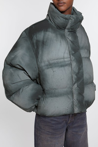 Puffer down jacket features a sprayed finish treatment and a branded logo patch at the back neckline. Complete with a centre front zipper and velcro placket closure. Constructed with an internal adjustable drawcord hem. Cut to a relaxed fit with slightly dropped shoulders and hip length. - Relaxed fit - Hip length - Padded down - Sprayed finish - Water repellent - Logo tab centre back - Zipper and velcro closure - Side seam pockets - Internal pocket - Elasticated cuffs - Internal adjustable drawcord - Model is 180cm/ 5'11 and wears a size 36 - Style ID: FN-WN-OUTW000958 - Main material made from recycled nylon. Filling made from recycled down and recycled feathers. - Shell: 100% Nylon, Lining: 100% Nylon, Filling: 90% Duck down, 10% Duck feather