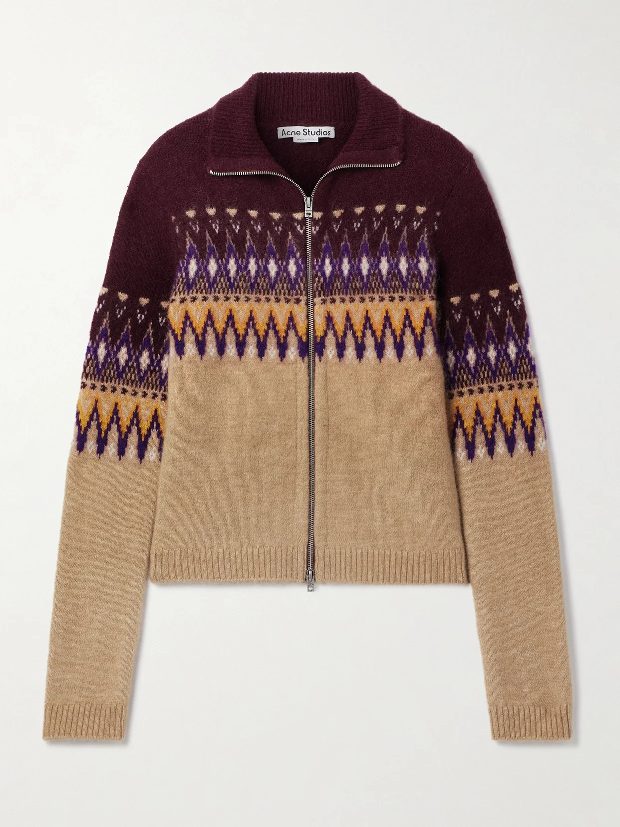 Acne Studios' cardigan gives the classic Fair Isle motif a colorful upgrade. It's knitted with touches of mohair and wool for a warm, soft handle and has ribbed trims. Layer it over a simple T-shirt or tank. Lower-Impact Materials. This product is made using at least 50% lower-impact materials or ingredients. Find out more about our NET SUSTAIN criteria here.