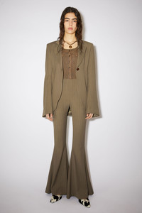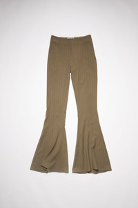 Acne Studios khaki green casual trousers are striped with a fluid appearance, cut to a fitted silhouette with flared legs and detailed with a discrete zippered closure on the side. - Fluid twill fabric - Invisible zip closure with a hook and eye - Style ID: FN-WN-TROU000930 - Fitted fit - Mid rise - Long length - European sizing - Model is 176 cm / 5′8″ and wears a size 36 - Shell: 55% Viscose, 44% Wool, 1% Polyester