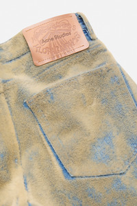 Trousers made from textured denim with a crosshatch weave. The fabric is treated with a special dyeing and flocking process that gives it a unique green-yellow tint over an indigo base. Finished with front creases, side and back pockets, a button fly, and a leather logo patch. Cut to a loose fit. - Loose fit - Front creases - Side and back pockets - Button fly closure - Leather logo patch - Model is 177 cm / 5'8 and wears a size 36 - Style ID: FN-WN-5PKT000541 - Shell: 100% Cotton, Contrast: 100% Polyester, Patch: 100% Cow leather