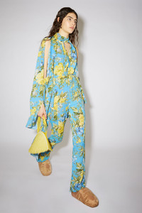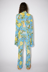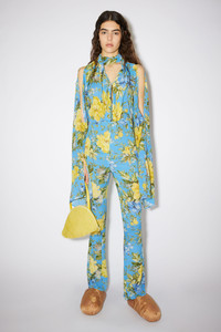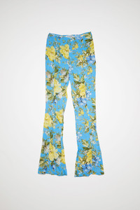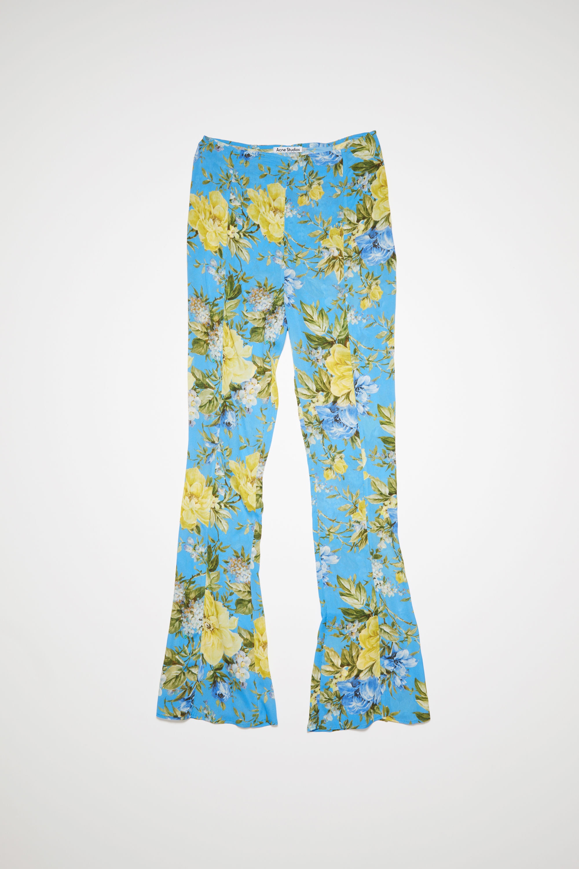 Acne Studios blue trousers feature an all-over exclusive flower artwork print, crafted from a fluid fabric and detailed with discrete zipper closure. Cut to a fitted silhouette with a long flared length. - All-over exclusive flower artwork print - Discrete zipper closure with hook and eye - Style ID: FN-WN-TROU000911 - Made in Italy - Fitted fit - Flared leg - Long length - European sizing - Model is 180 cm / 5’11” and wears a size 36 - Shell: