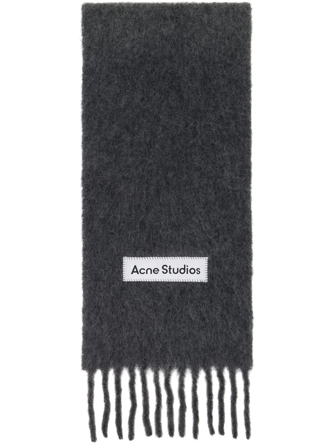 Rectangular brushed alpaca- and wool-blend flannel scarf. · Gradient throughout · Logo patch at face · Fringed detailing at ends · L88" x W11" Supplier color: Dark Grey 33% alpaca, 25% wool, 22% nylon, 20% mohair. Made in Italy 261129F028003